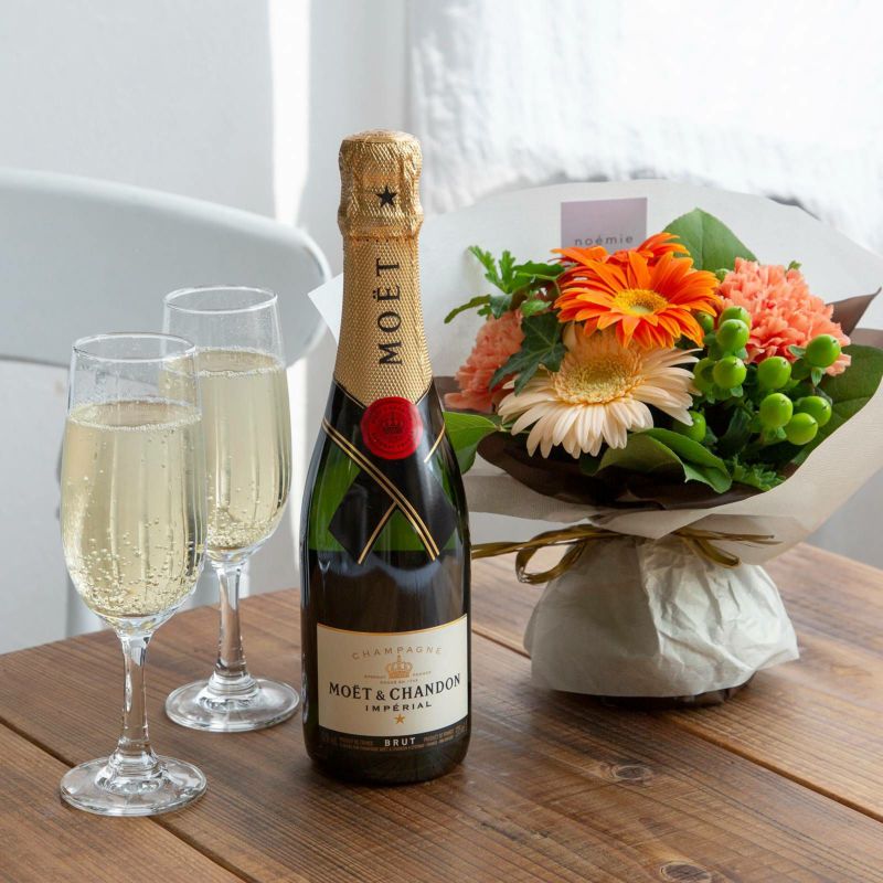 モエ・エ・シャンドンのアイコン的存在、「モエ・アンペリアル」。このシャンパーニュは、1869年に、ナポレオンの生誕100年を記念して誕生した銘柄です。ピノ・ノワールを中心にバランスよくブレンドされた、飲みやすく、フルーティで爽快感に満ちた1本です。和洋中とどんな料理とも合わせやすいのが魅力。大人ナチュラルな花束とセットでお届けします。