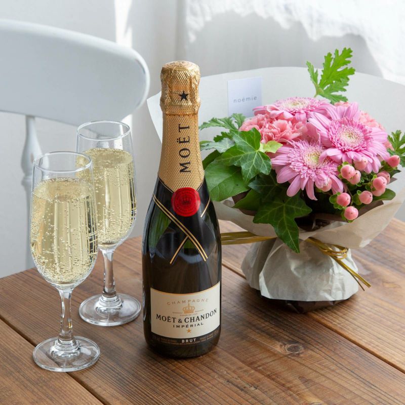 モエ・エ・シャンドンのアイコン的存在、「モエ・アンペリアル」。このシャンパーニュは、1869年に、ナポレオンの生誕100年を記念して誕生した銘柄です。ピノ・ノワールを中心にバランスよくブレンドされた、飲みやすく、フルーティで爽快感に満ちた1本です。和洋中とどんな料理とも合わせやすいのが魅力。大人ナチュラルな花束とセットでお届けします。