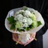 ころころとしたシルエットが愛らしいピンポンマム。花言葉は“君を愛す”。そして、緑のカーネーションの花言葉は“純粋な愛情”。あなたの想うあの人に、あふれる想いを伝えてくれる花束です。