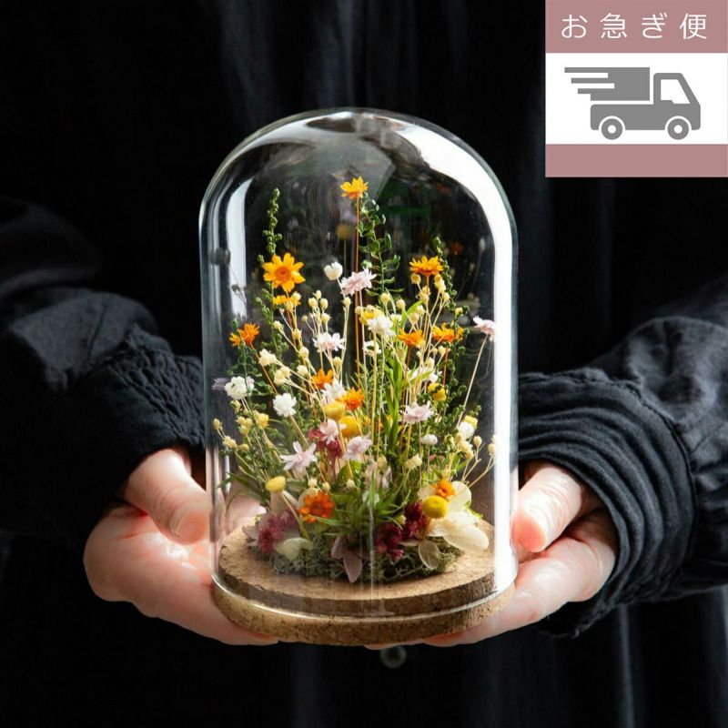 【ご注意】繊細なアレンジのため、配送時の揺れ等により、お届け時に素材がガラスに付着している場合があります。その場合、ドームを開き柔らかい布などで付着物を取り除いてください。