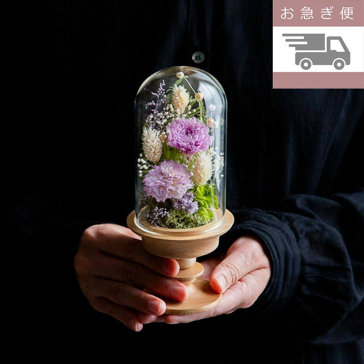 ガラスドームを守りながら、中のお花をご覧いただける専用ボックスで、大切にお届けします。