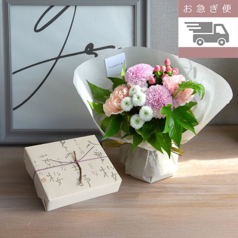 そめい吉野、八重桜、葉桜3種のお線香を花束に添えて 【お急ぎ便】3種の桜のお線香+そのまま飾れる菊てまりブーケ(M)/ピンク