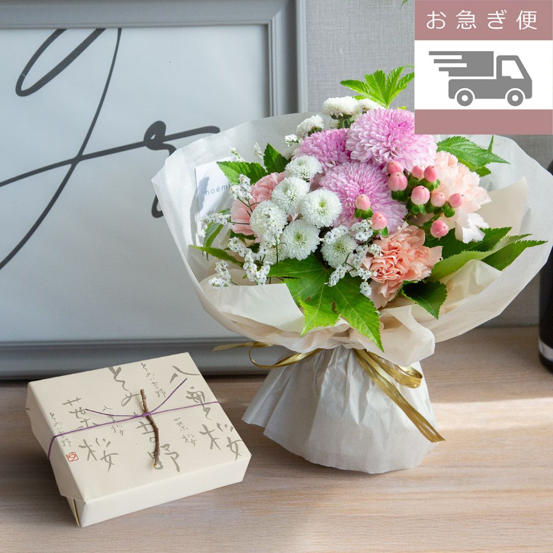 そめい吉野、八重桜、葉桜3種のお線香を花束に添えて 【お急ぎ便】3種の桜のお線香+そのまま飾れる菊てまりブーケ(L)/ピンク