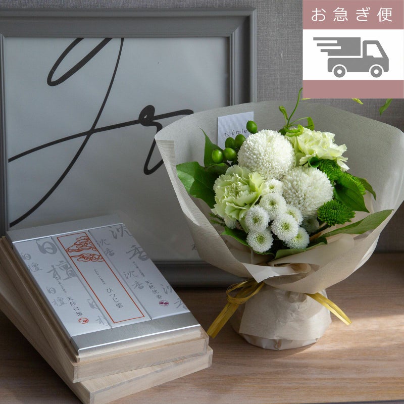 白檀・沈香・香炉灰とそのまま飾れる花束とのセットギフト。 【お急ぎ便】天然香木のお線香+そのまま飾れる菊てまりブーケ(M)/白