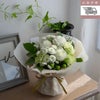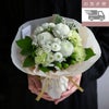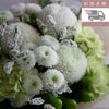 ころころとしたシルエットが愛らしいピンポンマム。花言葉は“君を愛す”。そして、緑のカーネーションの花言葉は“純粋な愛情”。あなたの想うあの人に、あふれる想いを伝えてくれる花束です。