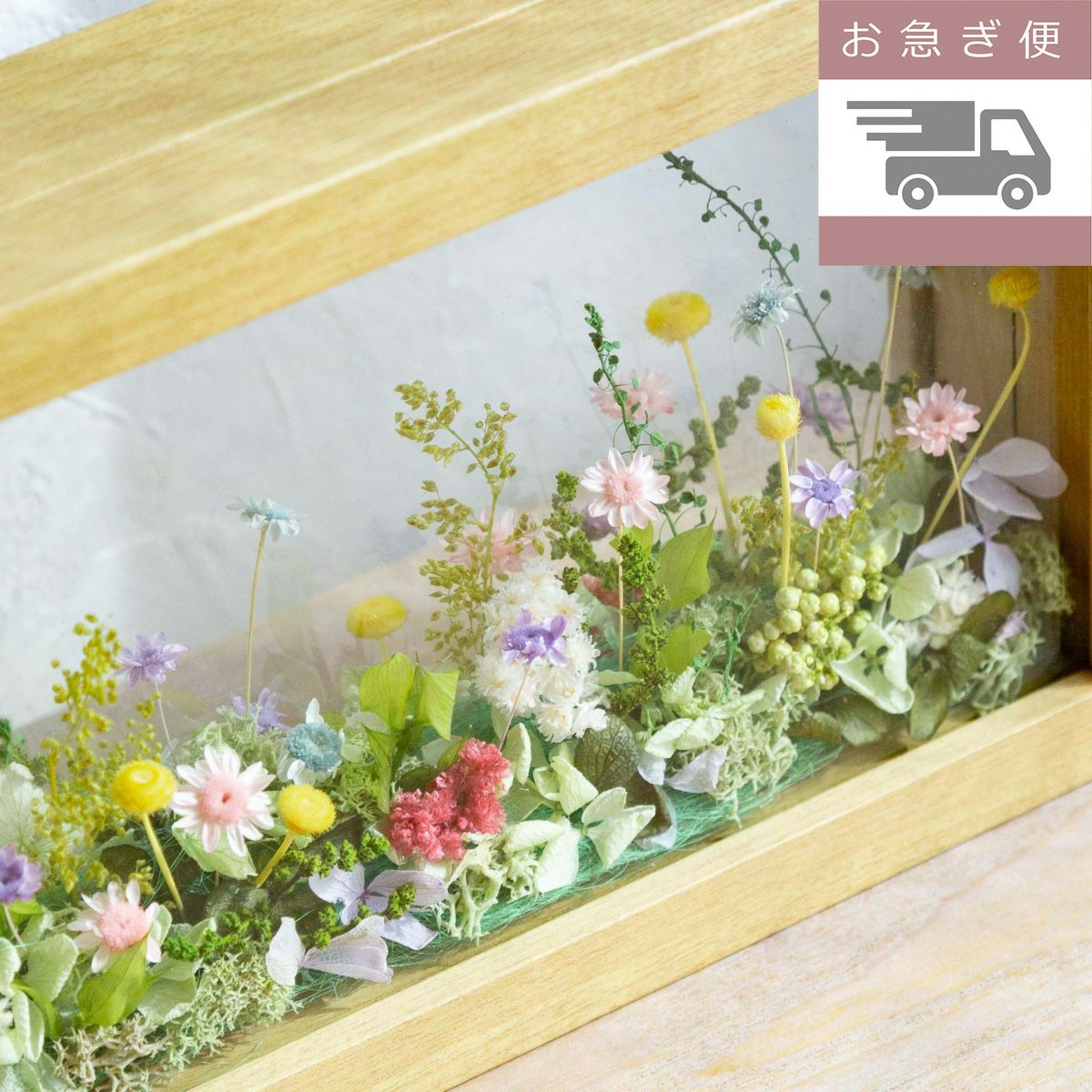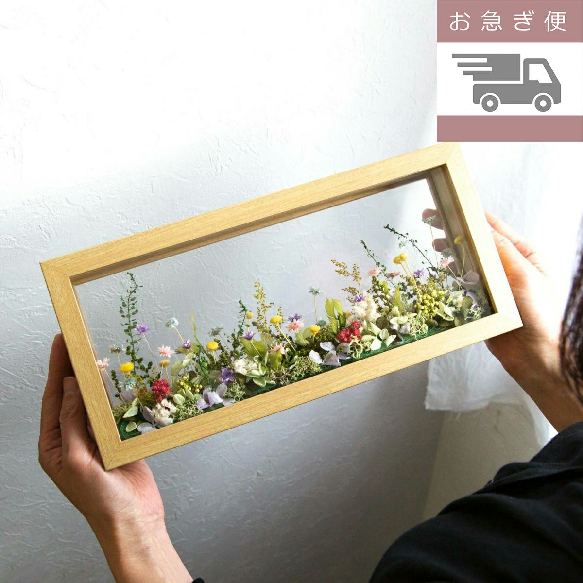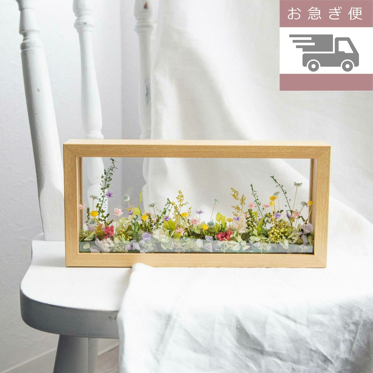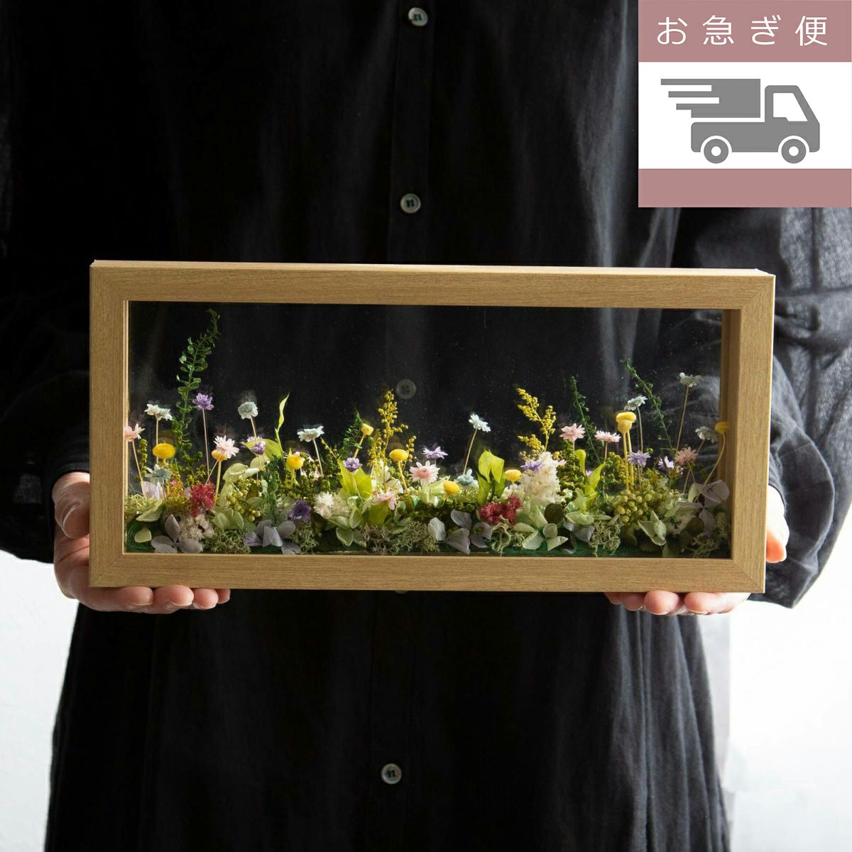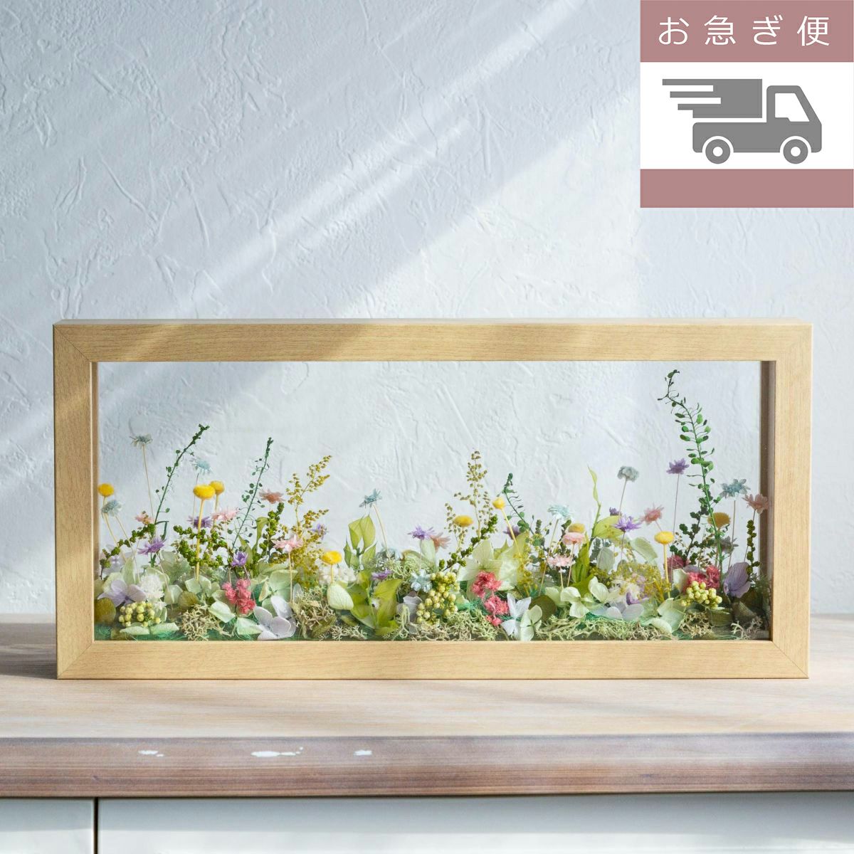 窓から見える、一面に咲き誇る花の草原をイメージしました。まるで美しい風景を切り取ったかのようなフレームアレンジメントです。 【お急ぎ便】ミルフルール(L)