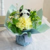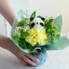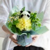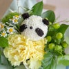 爽やかなイエローグリーン系の花々の中から、顔をのぞかせる花のぱんだ。甘くなりすぎないカラーリングで、どこか大人っぽさも感じるキュートなどうぶつブーケです。