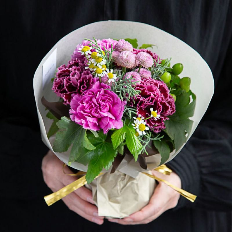 幾重にも広がる花びらが美しいアンティークパープルの大輪カーネーションに、鮮やかなピンクのカーネーションとスプレーマムをプラス。明るいグリーンをあわせることで、エレガントさとフレッシュさを感じさせます。