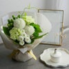 ころころとしたシルエットが愛らしいピンポンマム。花言葉は“君を愛す”。そして、緑のカーネーションの花言葉は“純粋な愛情”。あなたの想うあの人に、あふれる想いを伝えてくれる花束です。