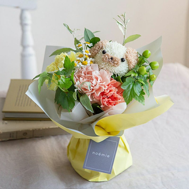 大切な人に笑顔を届ける 生花でつくった“どうぶつ”ブーケシリーズ 【成人式】そのまま飾れる“こいぬ”のブーケ(M)