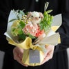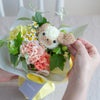 やわらかなパステルカラーの花々の中から、顔をのぞかせる花のこいぬ。甘くなりすぎないカラーリングで、どこか大人っぽさも感じるキュートなどうぶつブーケです。
