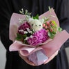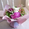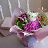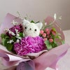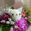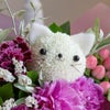 ビビットなピンクパープル系の花々の中から、顔をのぞかせる花のこねこ。甘くなりすぎないカラーリングで、どこか大人っぽさも感じるキュートなどうぶつブーケです。