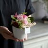 ■素材:プリザーブドフラワー:ローズ、カーネーション、アジサイ、他/ハンドメイドフラワー/陶製花器、紙製タグ、ラフィア/クリアケース入り