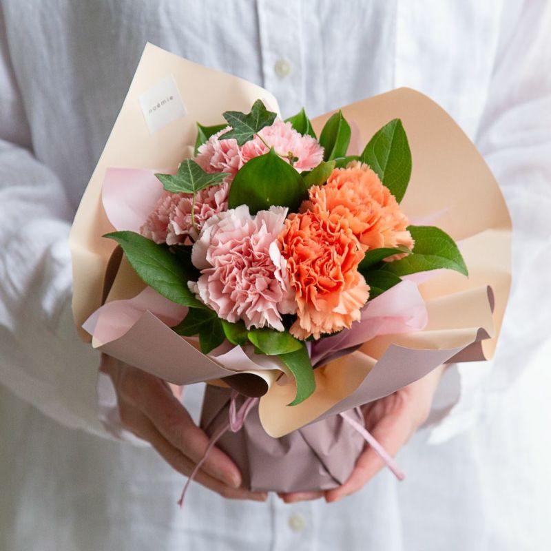 【セット内容の詳細】 ① そのまま飾れる花束 ■サイズ:約H200×W230 ■素材:生花(大輪カーネーション5本、アイビー、レモンリーフ 他)/エコゼリー、ラッピングペーパー、ラフィア、取扱 説明カード ※写真のカーネーションは開花した状態です。お届けの際は、開花前のつぼみが混ざった状態でお届けする場合があります。 ※本品は、花束と菓子を同梱の上、配送させていただきます。ただし、他の商品と同梱しての配送は、花の品質保持の理由により出来かねますので、ご了承下さい。