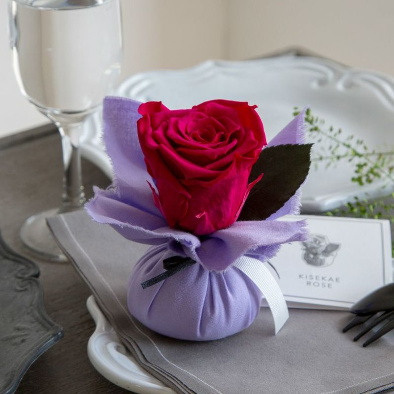 フレッシュな生花を楽しみ、その後は一輪のプリザーブドローズをサシェに。