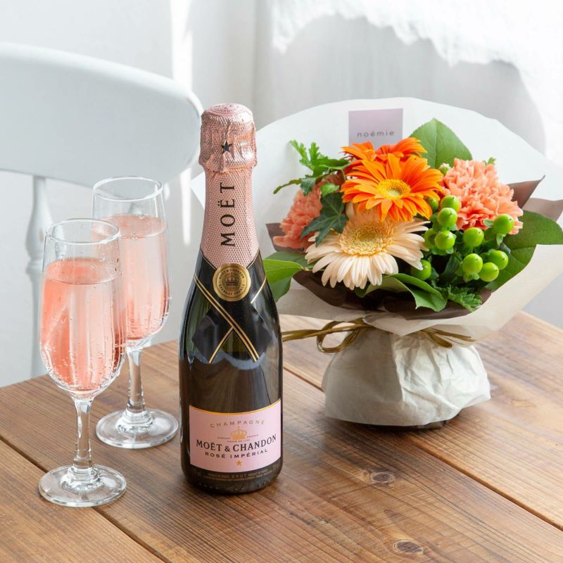 ロマンティックなピンクのシャンパーニュとそのまま飾れる花束とのセットギフト。 ロゼアンペリアル+そのまま飾れるナチュラルブーケ(M)/オレンジ
