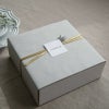 アレンジはケースに収め、4面を上質なグレイのペーパーで丁寧に包みました。サテン地のゴールドリボンとブランドタグ、プリザーブドグリーンのアクセントで、華やかで上品な仕上がりに致しました。