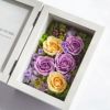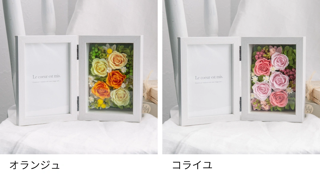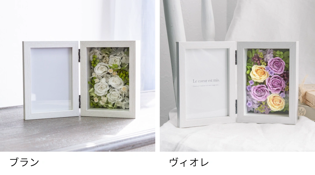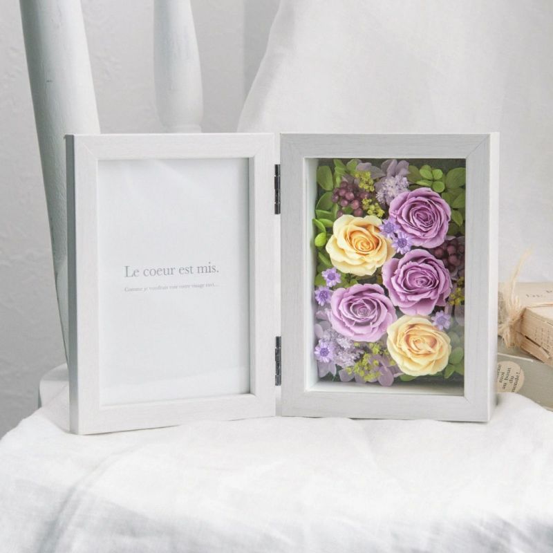 本のように開くバラのフレームアレンジメントをご用意しました。花と緑はすべてプリザーブドフラワー&ドライフラワーですので、長期間お楽しみいただけます。