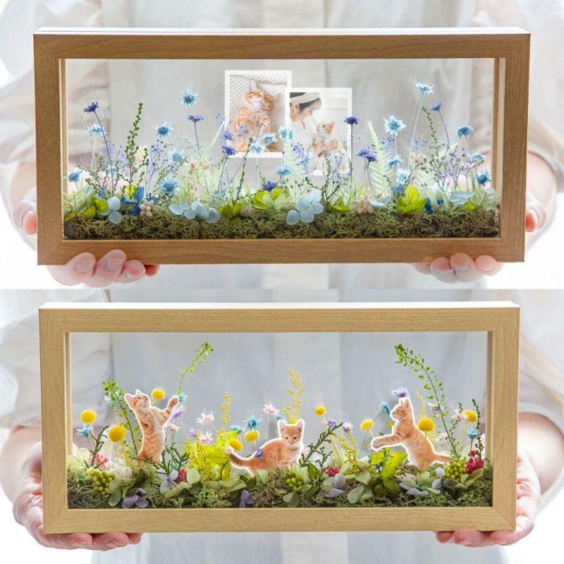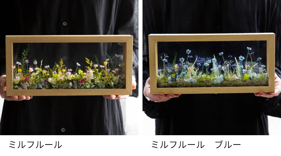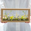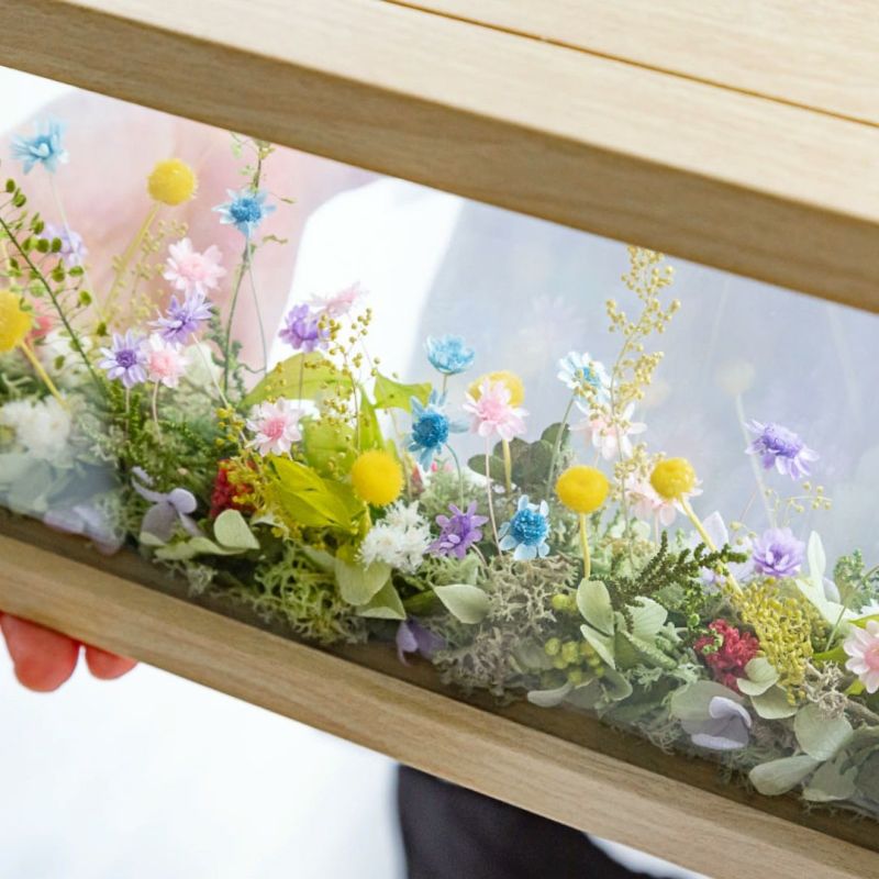 まるで窓から見える美しい風景を切り取ったかのようなフレームアレンジメントをご用意しました。花と緑はすべてプリザーブドフラワー&ドライフラワーですので、長期間お楽しみいただけます。