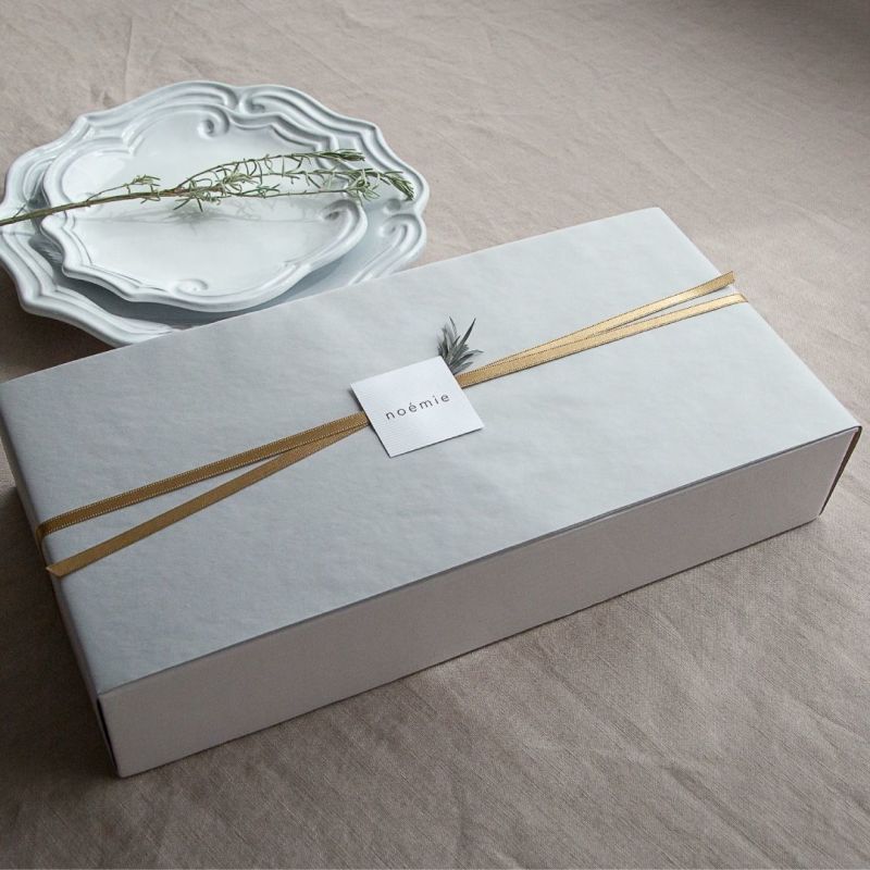 アレンジはケースに収め、4面を上質なグレイのペーパーで丁寧に包みました。サテン地のゴールドリボンとブランドタグ、プリザーブドグリーンのアクセントで、華やかで上品な仕上がりに致しました。
