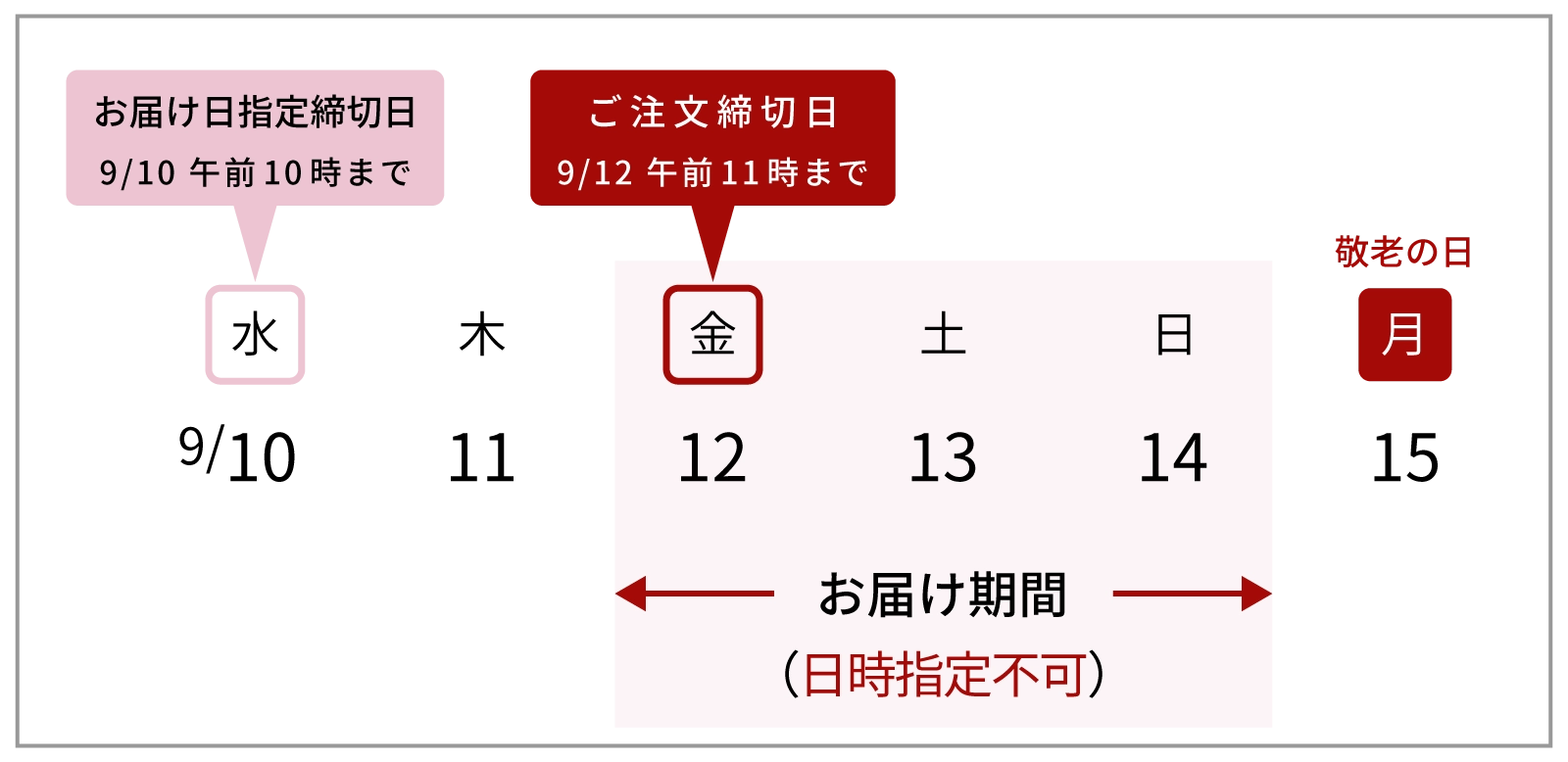 期間内(9/12~9/14)のいずれかの日にお届けいたします。