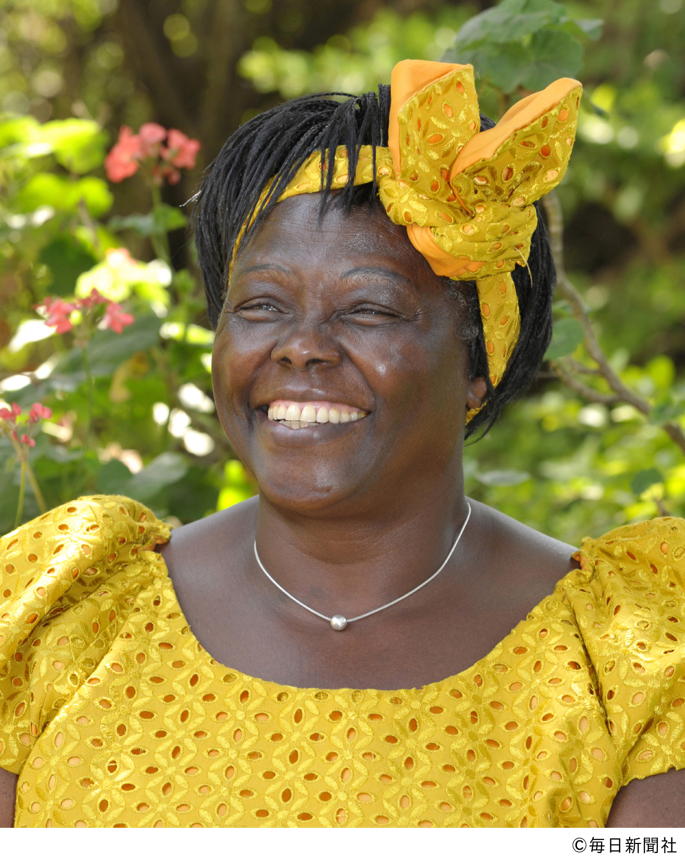 ケニア出身。60年政府留学生として米ピッツバーグ大学で修士号取得。71年ナイロビ大学で生物分析学の博士号取得。「開発」の名の下で行われる環境破壊と、開発の恩恵から阻害される市民の姿を目の当たリにし、77年農村地帯の女性に植樹を通じて社会参加を呼び掛ける「グリーンベルト運動」を創設。環境問題だけでなく女性の地位向上、貧困撲滅、民主化促進のためにも活動。02年国会議員初当選。03年環境副大臣就任。04年12月環境分野で初、アフリカ女性として初のノーベル平和賞受賞。05年2月毎日新聞社の招きで来日。編集局長とのインタビューで「MOTTAINAI」という日本語に出会ったことをきっかけにキャンペーンを提唱した。09年国連平和大使就任。11年9月25日永眠。