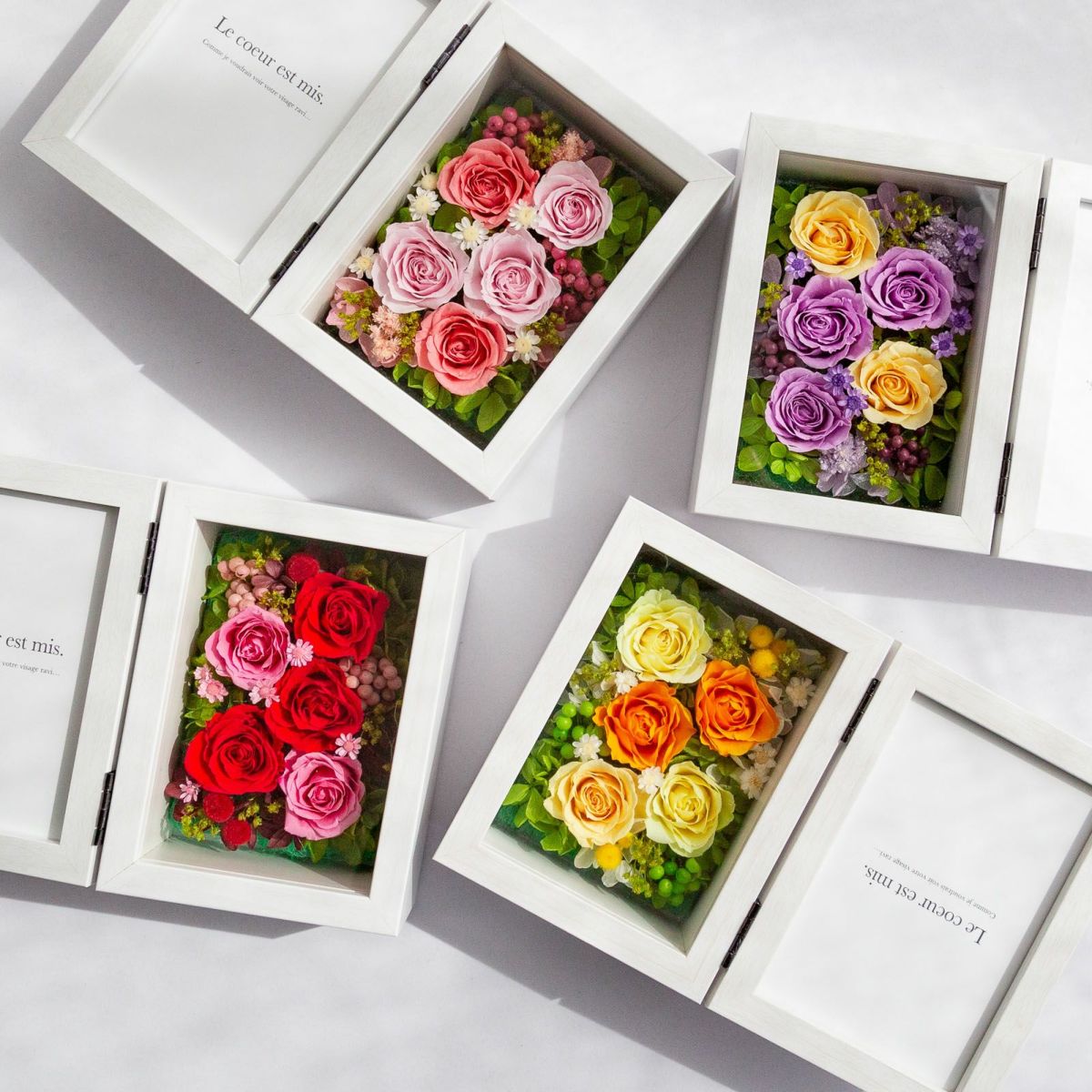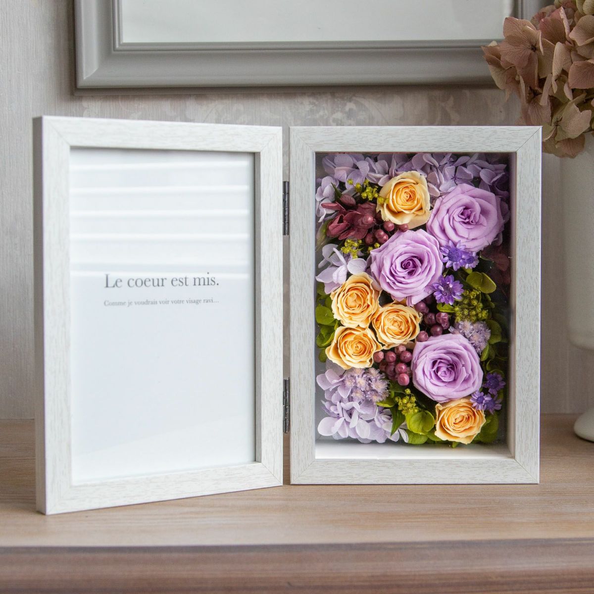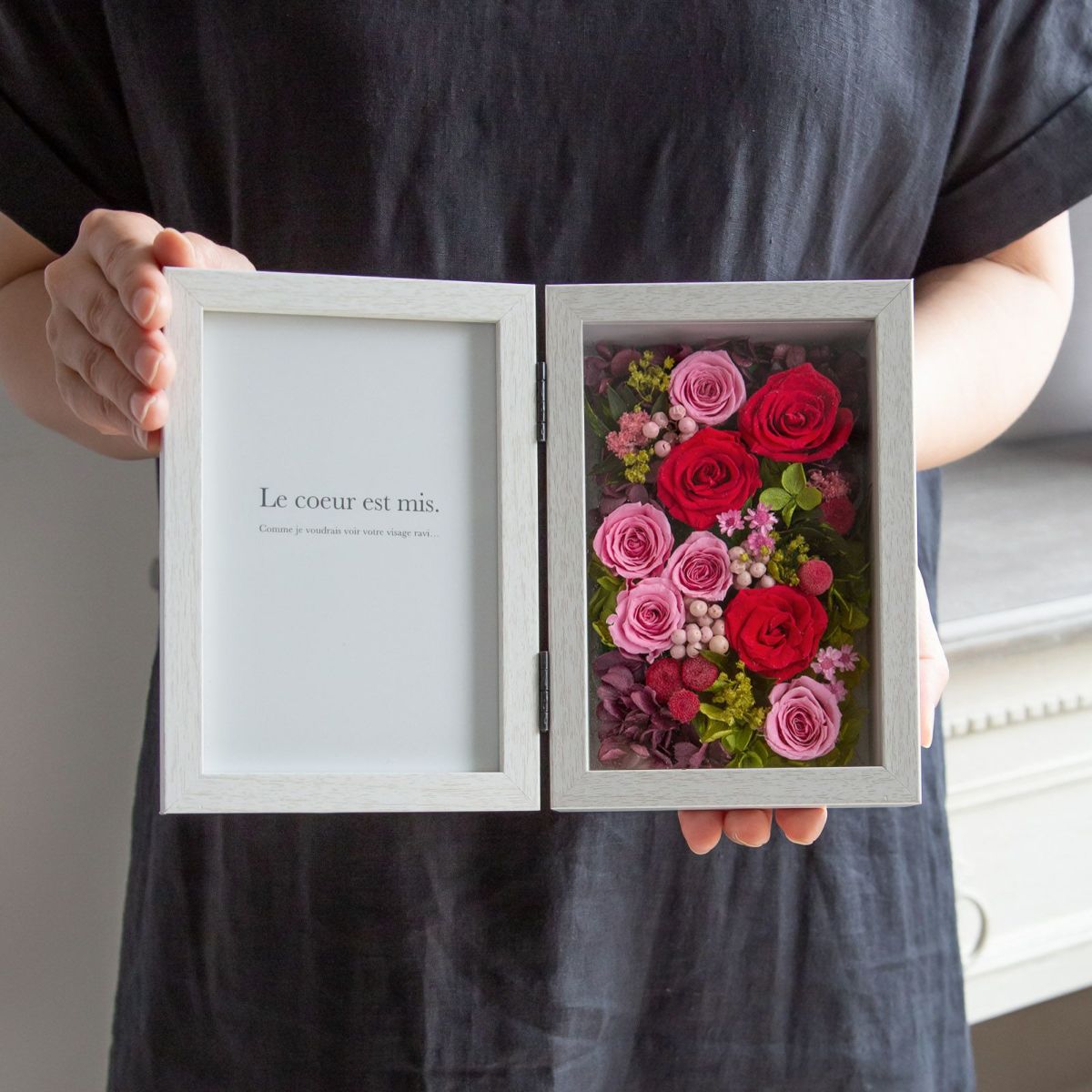 花言葉は「尊敬」「平和」。本のように開くバラのフレーム